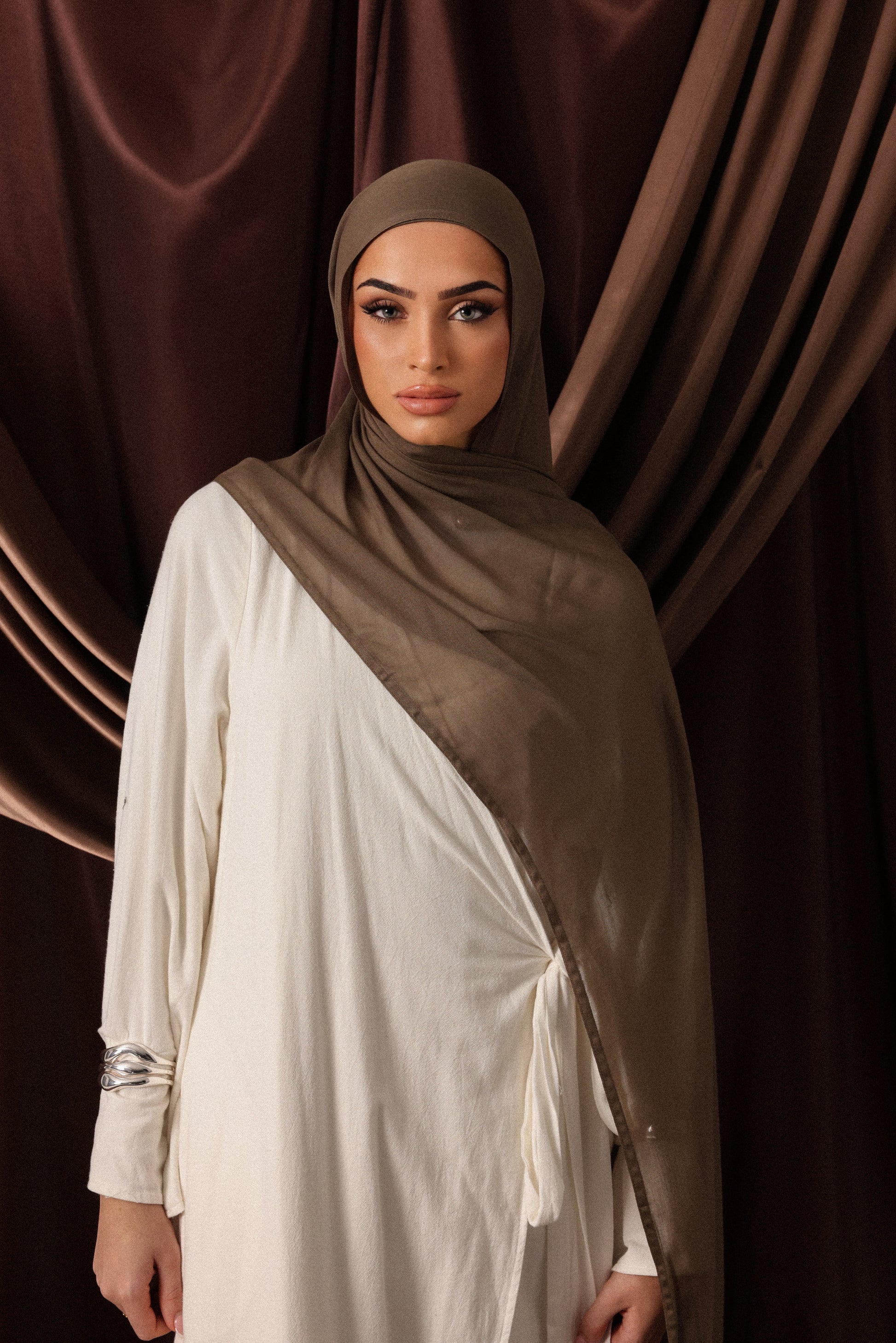 This design is made from custom dyed modal sets. Incredibly light weight and breathable fabric making sure its easy to style. Hijab features a double stitched frame.