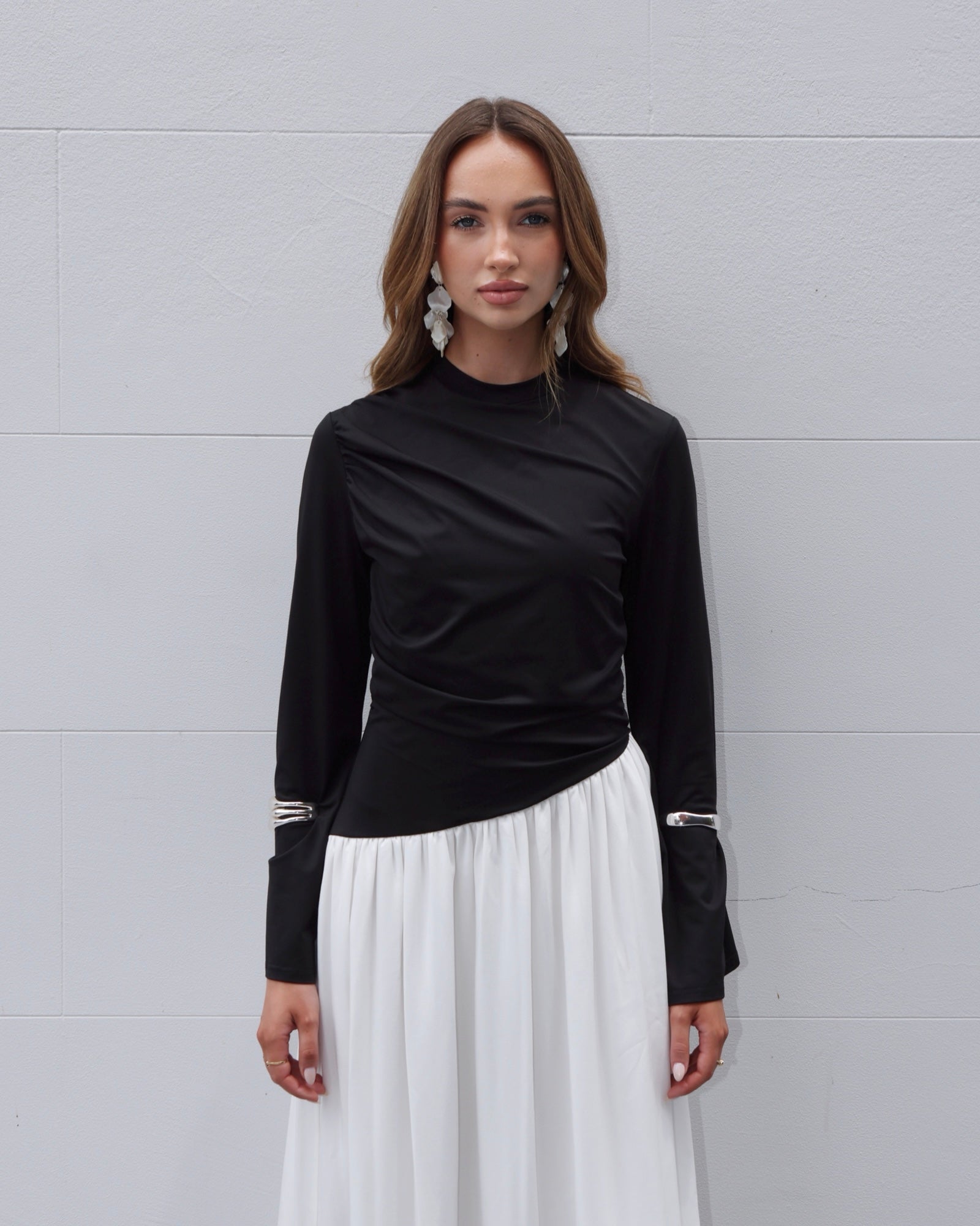 Designed in-house with meticulous attention to detail, the Azila Dress embodies elegance and modesty in perfect harmony. This flowy silhouette drapes beautifully, offering both class and comfort. Featuring a striking black and white contrast, the dress is fully lined from the waist down to ensure ease and confidence in every step.