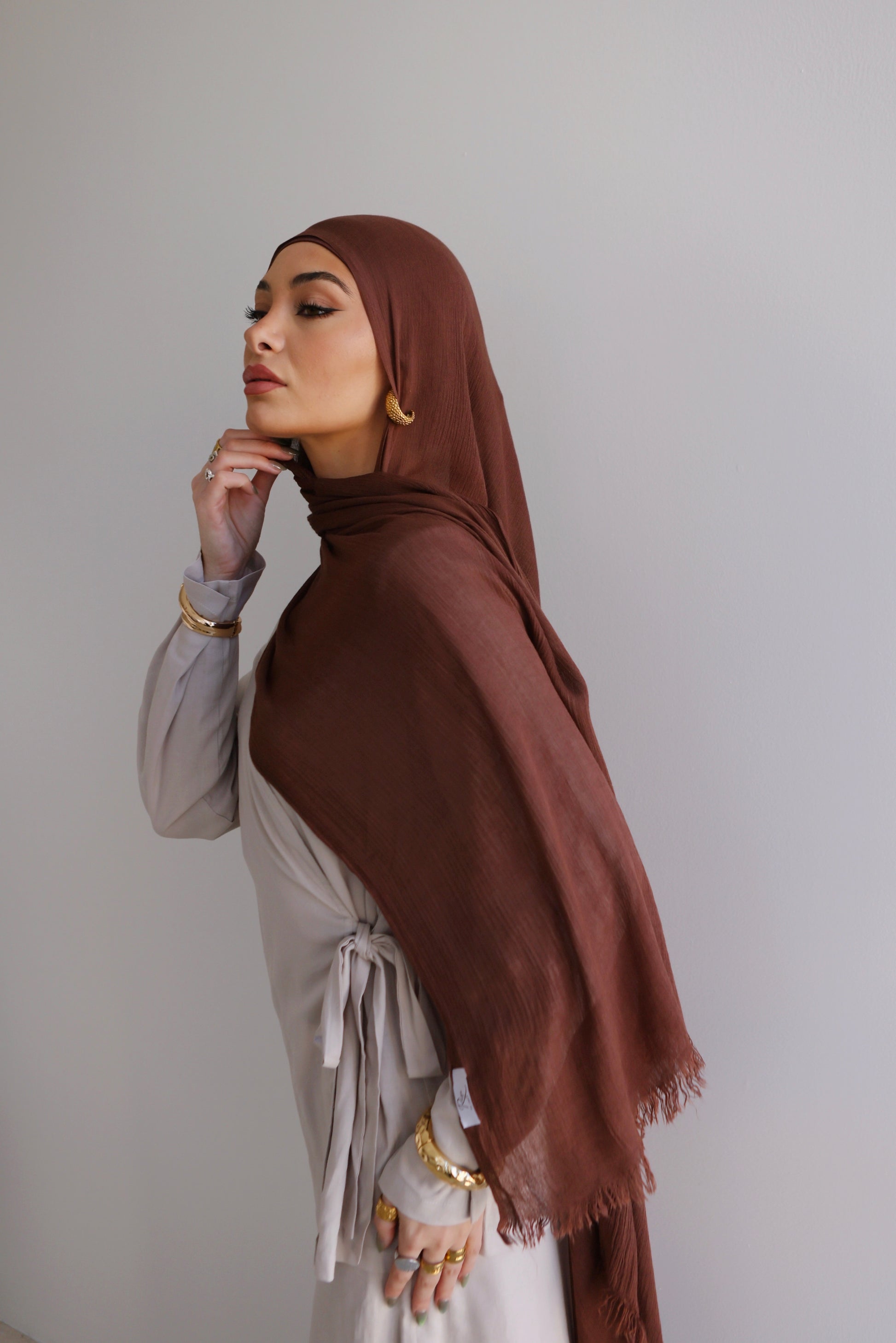 Crafted from soft solid rayon, this hijab offers the perfect balance of comfort and elegance. With a generous size of 185 x 85 cm, it provides versatile styling options—whether draped effortlessly or wrapped neatly. The lightweight, breathable fabric makes it ideal for everyday wear while ensuring full coverage. Finished with subtle raw edges, this piece adds a timeless touch to your modest wardrobe.