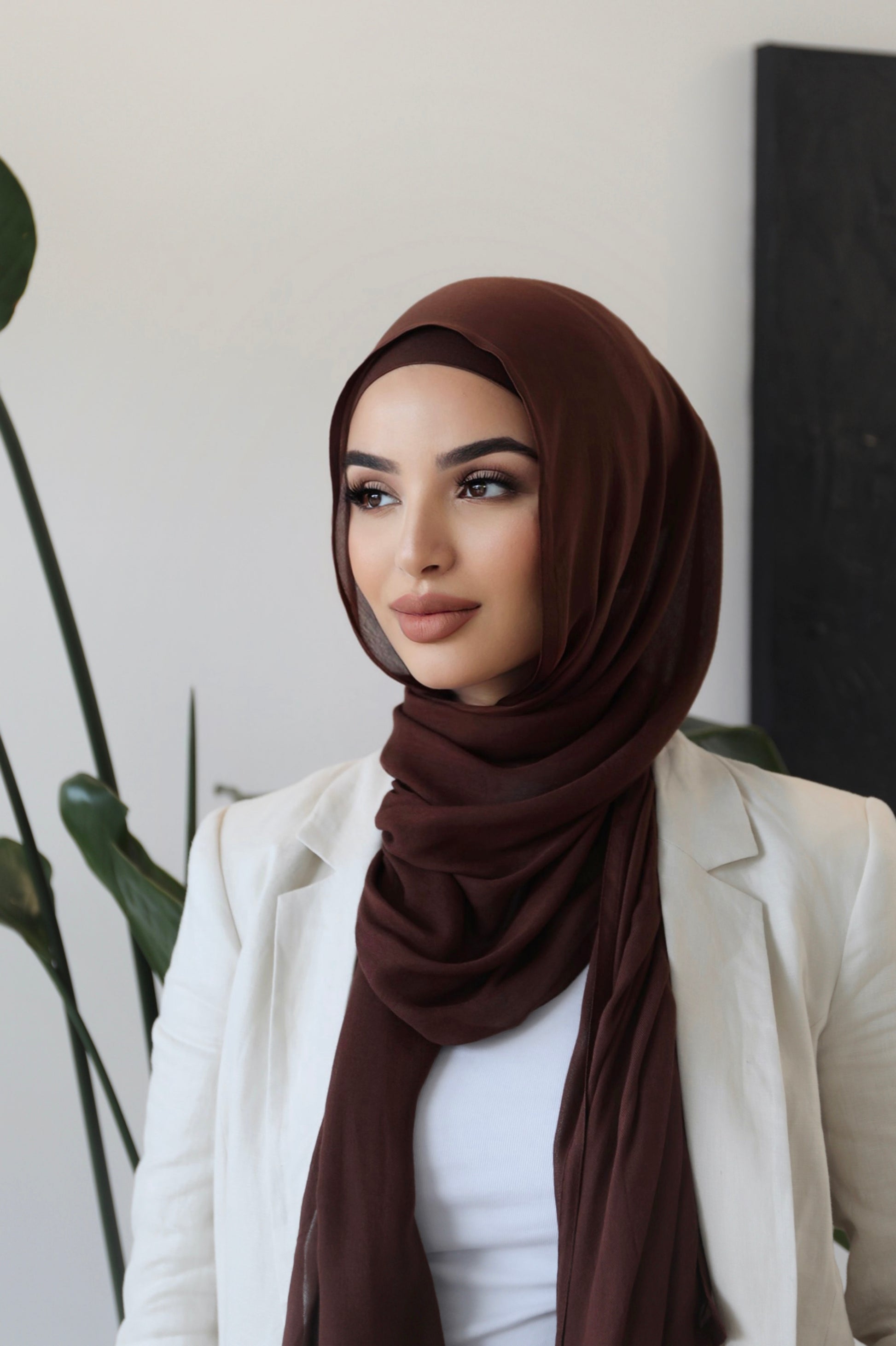 This design is made from custom dyed modal sets. Incredibly light weight and breathable fabric making sure its easy to style. Hijab features a double stitched frame.