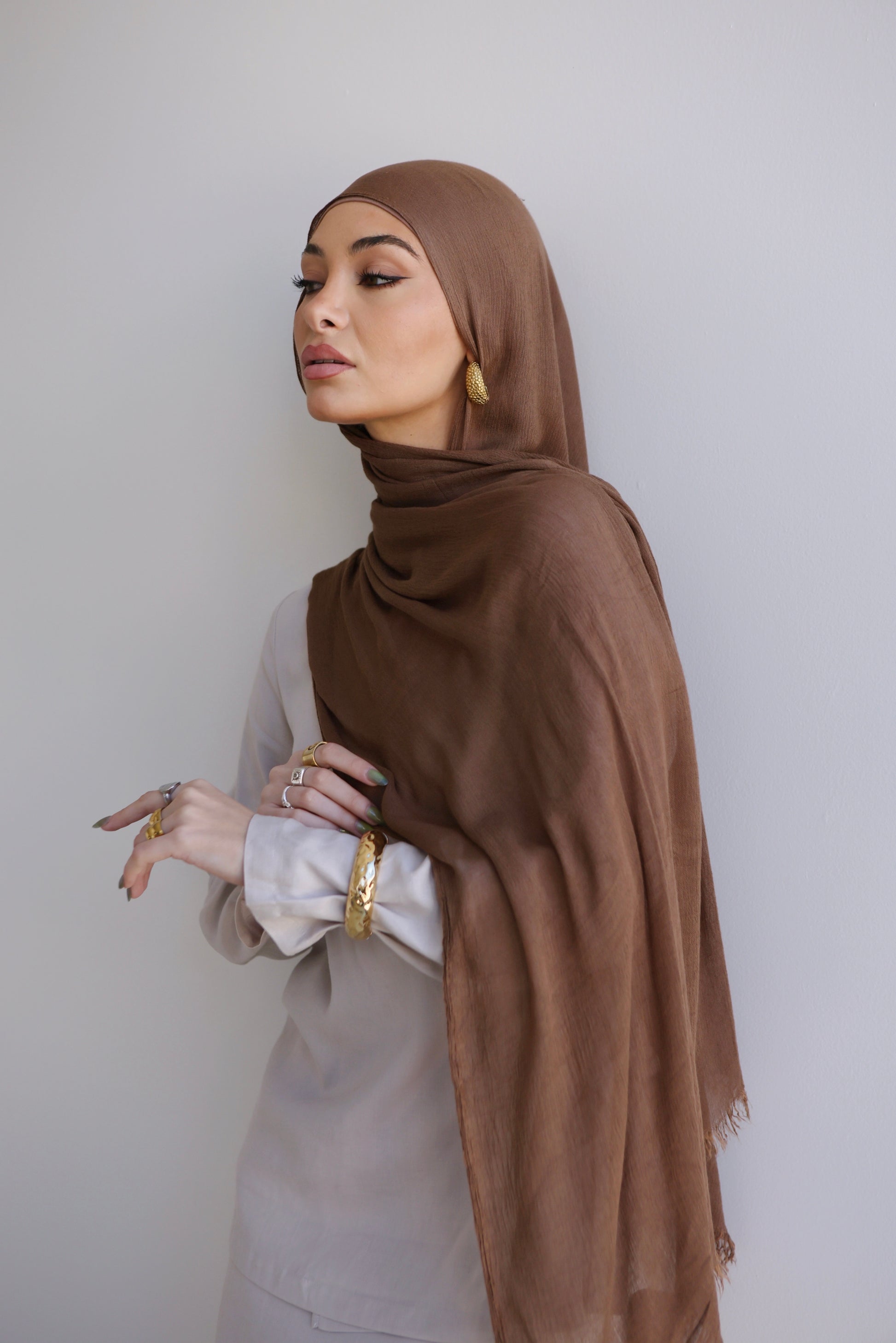 Crafted from soft solid rayon, this hijab offers the perfect balance of comfort and elegance. With a generous size of 185 x 85 cm, it provides versatile styling options—whether draped effortlessly or wrapped neatly. The lightweight, breathable fabric makes it ideal for everyday wear while ensuring full coverage. Finished with subtle raw edges, this piece adds a timeless touch to your modest wardrobe.