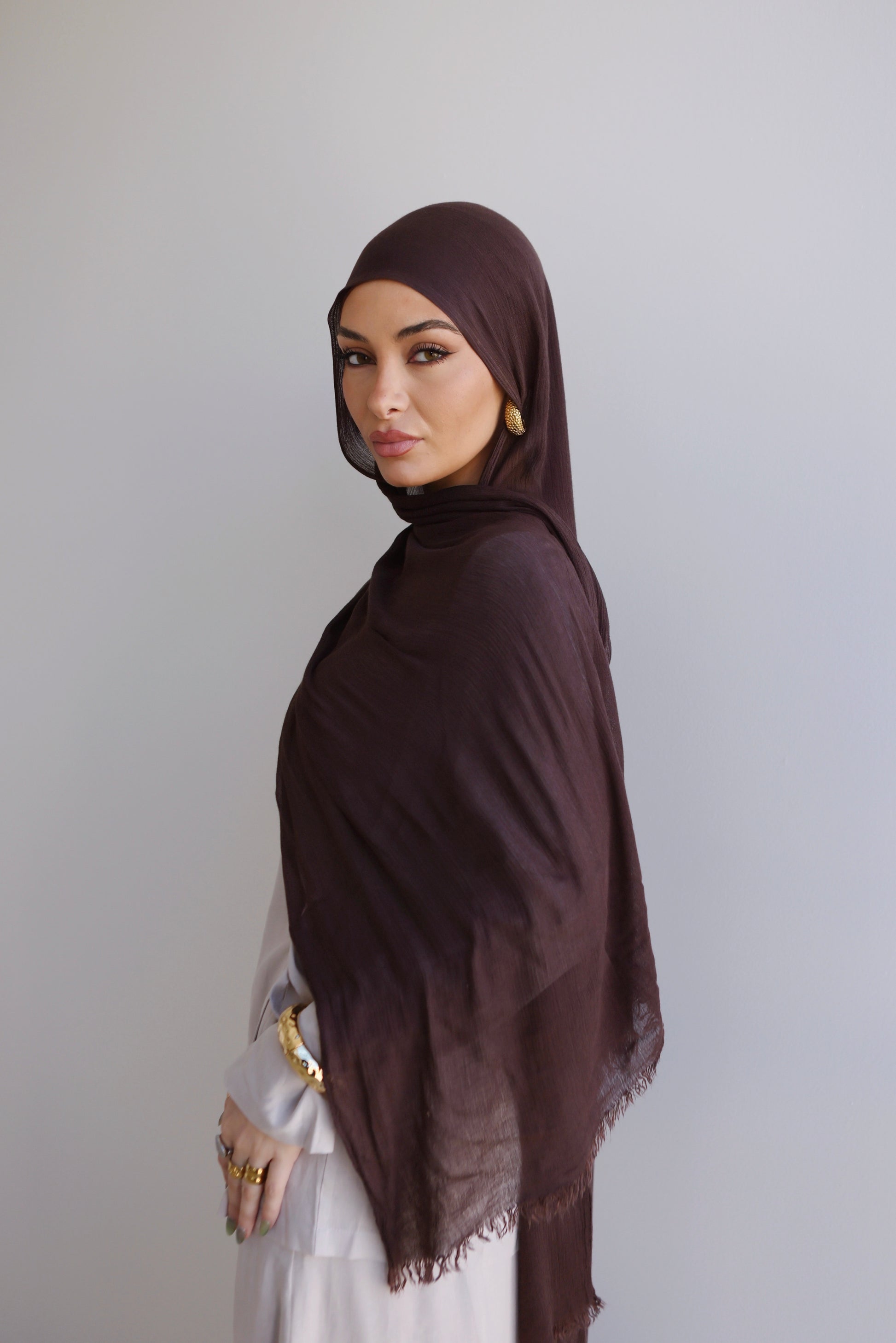 Crafted from soft solid rayon, this hijab offers the perfect balance of comfort and elegance. With a generous size of 185 x 85 cm, it provides versatile styling options—whether draped effortlessly or wrapped neatly. The lightweight, breathable fabric makes it ideal for everyday wear while ensuring full coverage. Finished with subtle raw edges, this piece adds a timeless touch to your modest wardrobe.