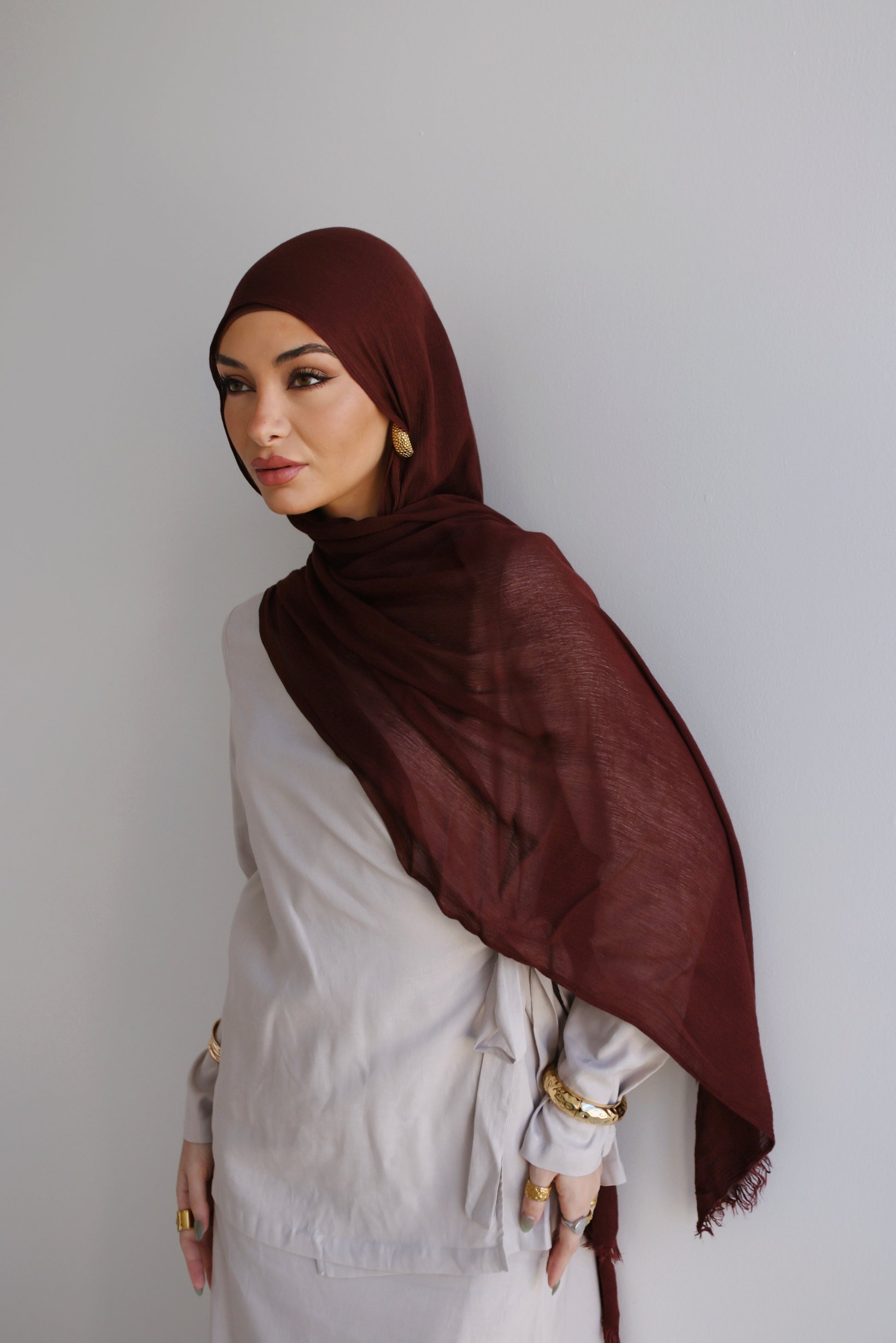 Crafted from soft solid rayon, this hijab offers the perfect balance of comfort and elegance. With a generous size of 185 x 85 cm, it provides versatile styling options—whether draped effortlessly or wrapped neatly. The lightweight, breathable fabric makes it ideal for everyday wear while ensuring full coverage. Finished with subtle raw edges, this piece adds a timeless touch to your modest wardrobe.