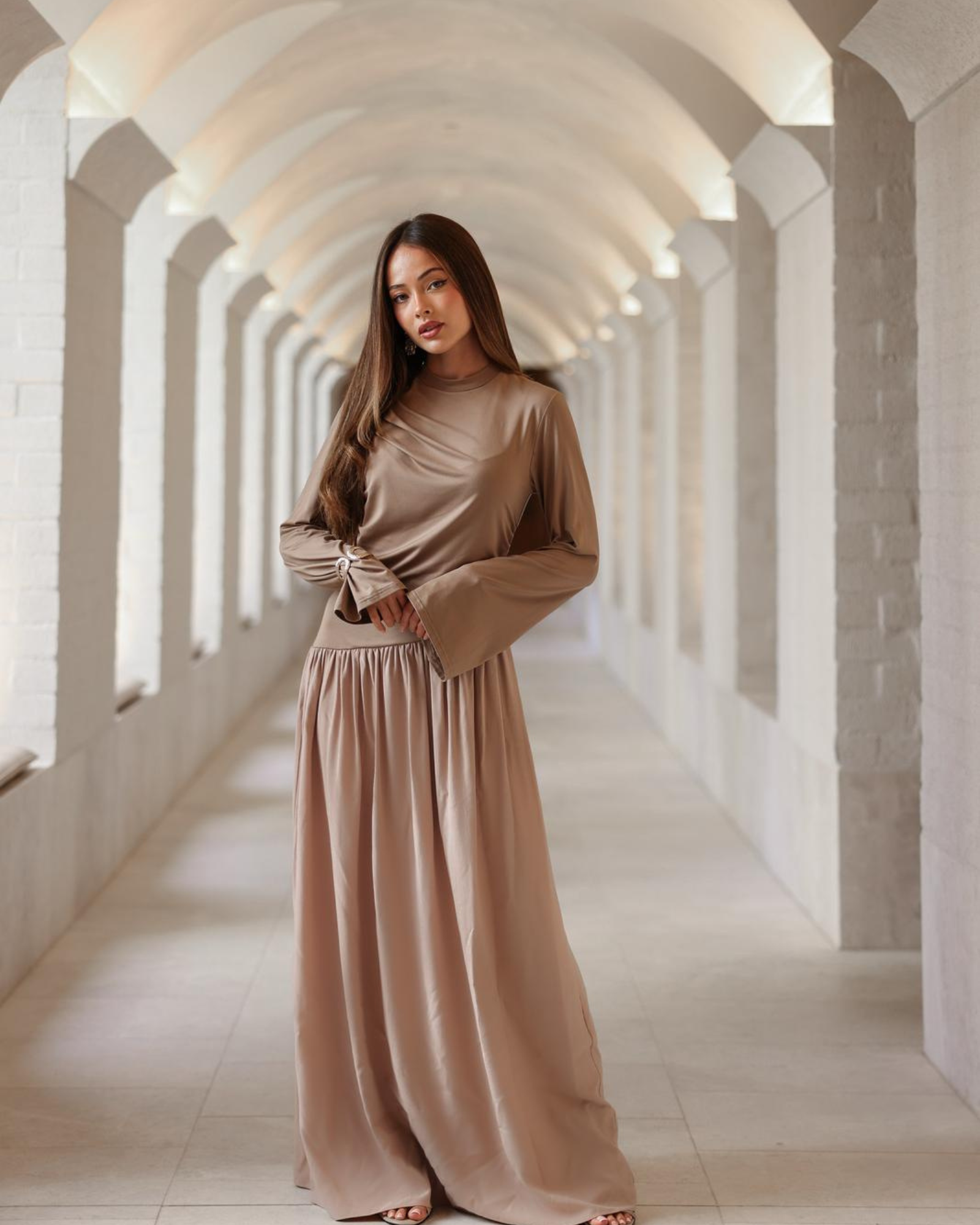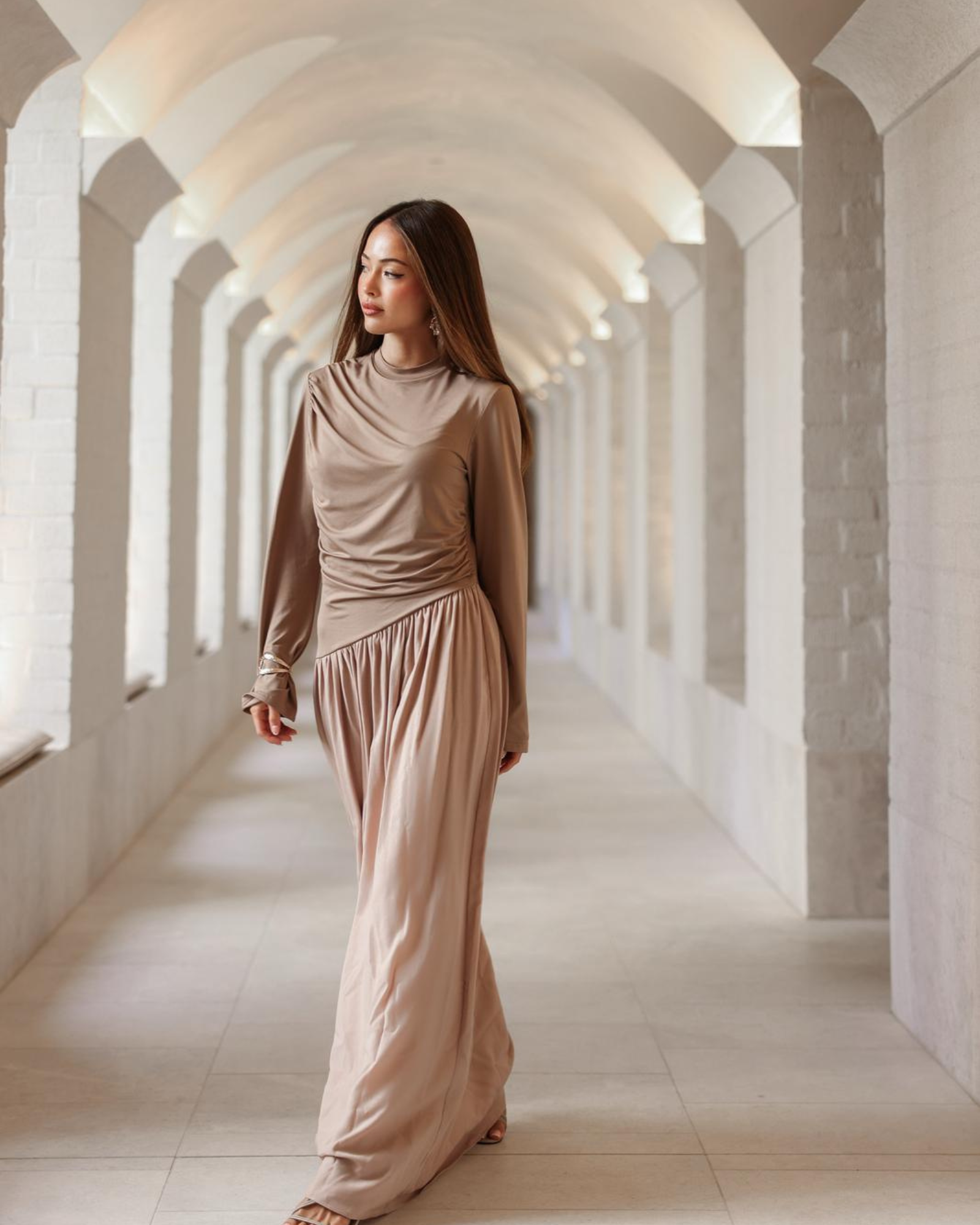 Introducing Monochrome Dress, a beautifully designed flowy piece that effortlessly blends sophistication with comfort. Crafted with a harmonious balance of cool and warm tones, this dress is the perfect addition to any wardrobe, offering a look that is both minimal and timeless.