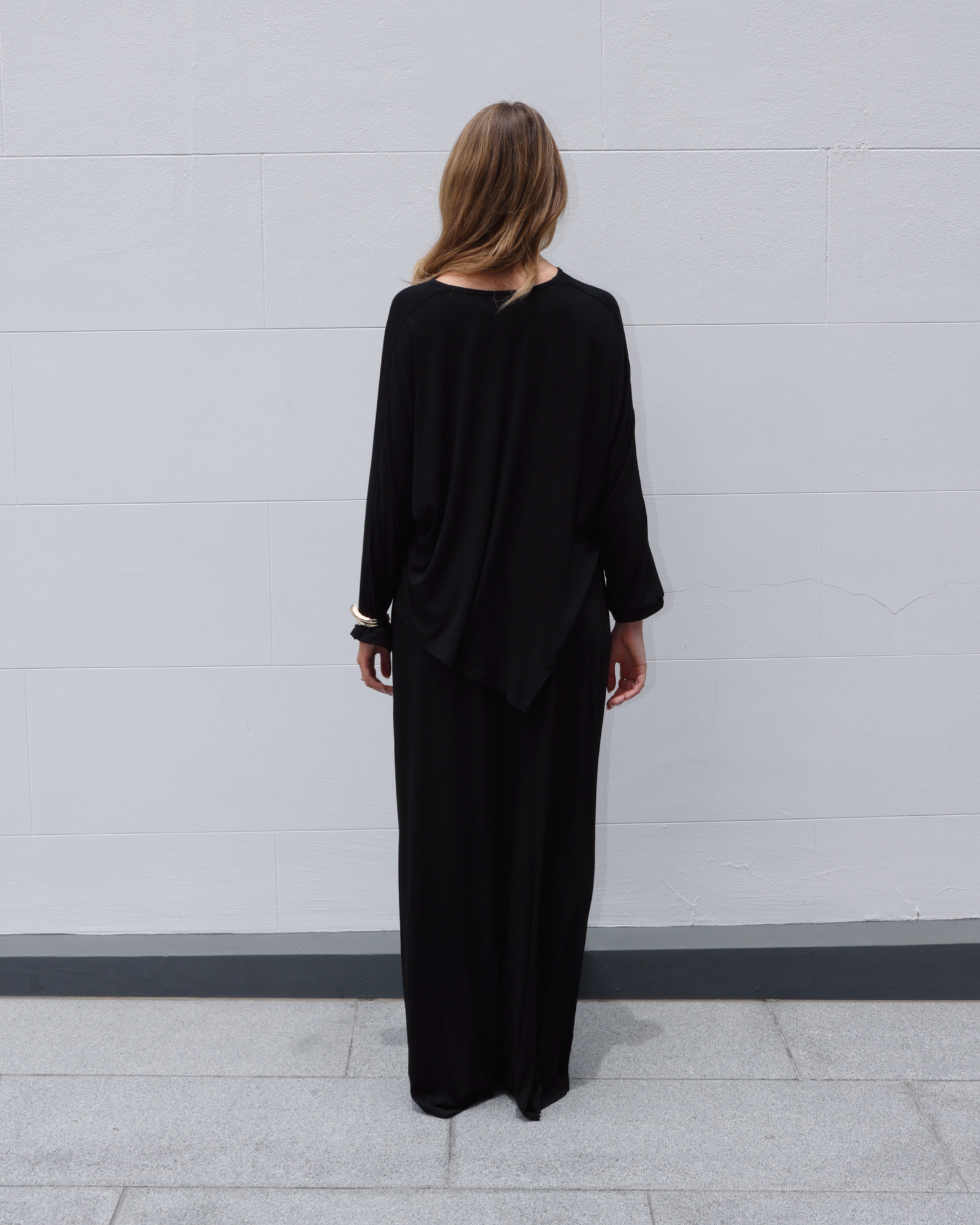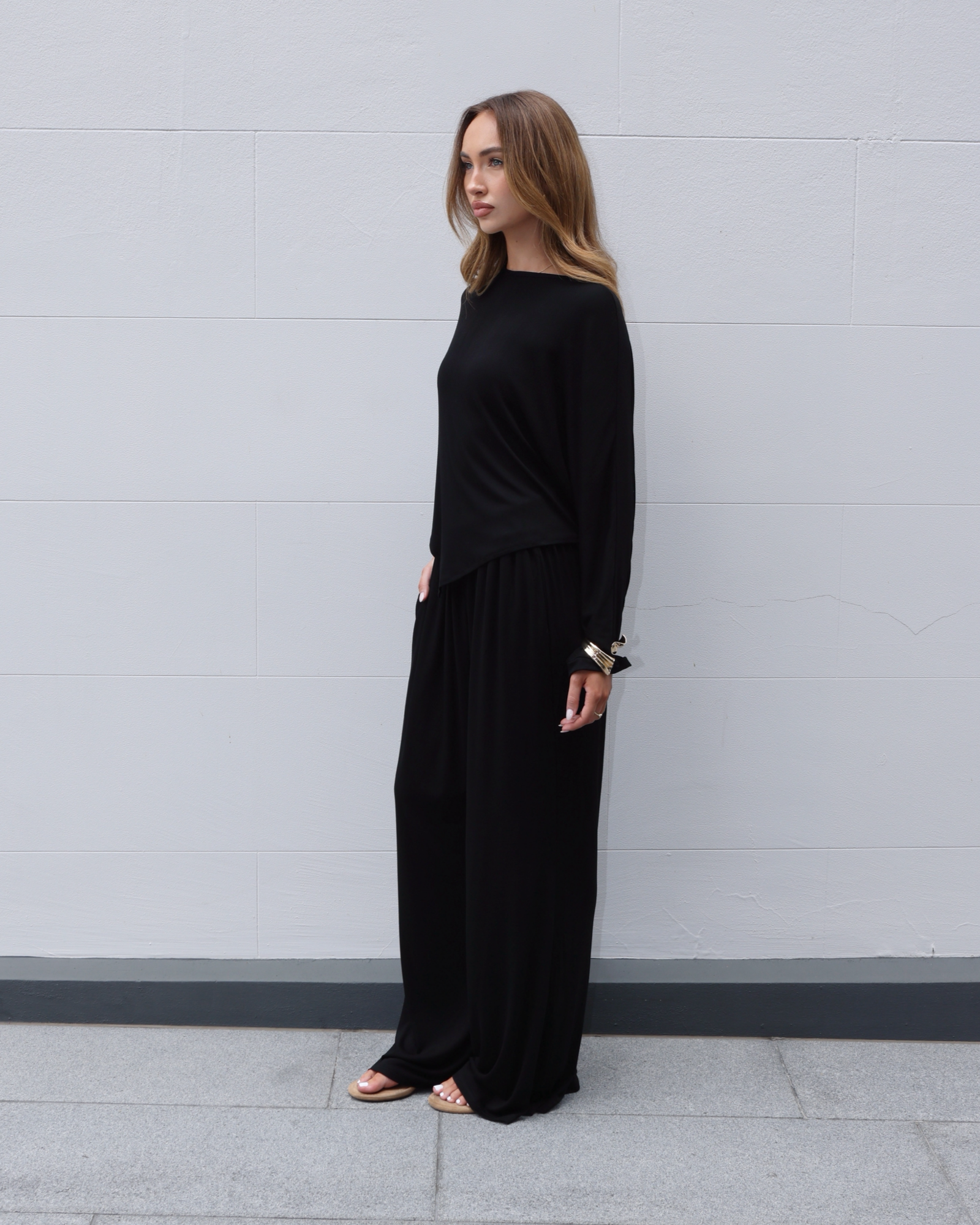 The top features a relaxed, flowy silhouette with an elegantly pointed hem that adds a touch of modern structure. Its loose-fit sleeves and seamless finish create a clean, elevated look that transitions effortlessly from casual to chic. Paired with wide-leg pants that fall beautifully from the waist, the entire set delivers ultimate ease without compromising style. The pants include a comfortable elastic waistband and a fluid, airy shape that flatters all body types.