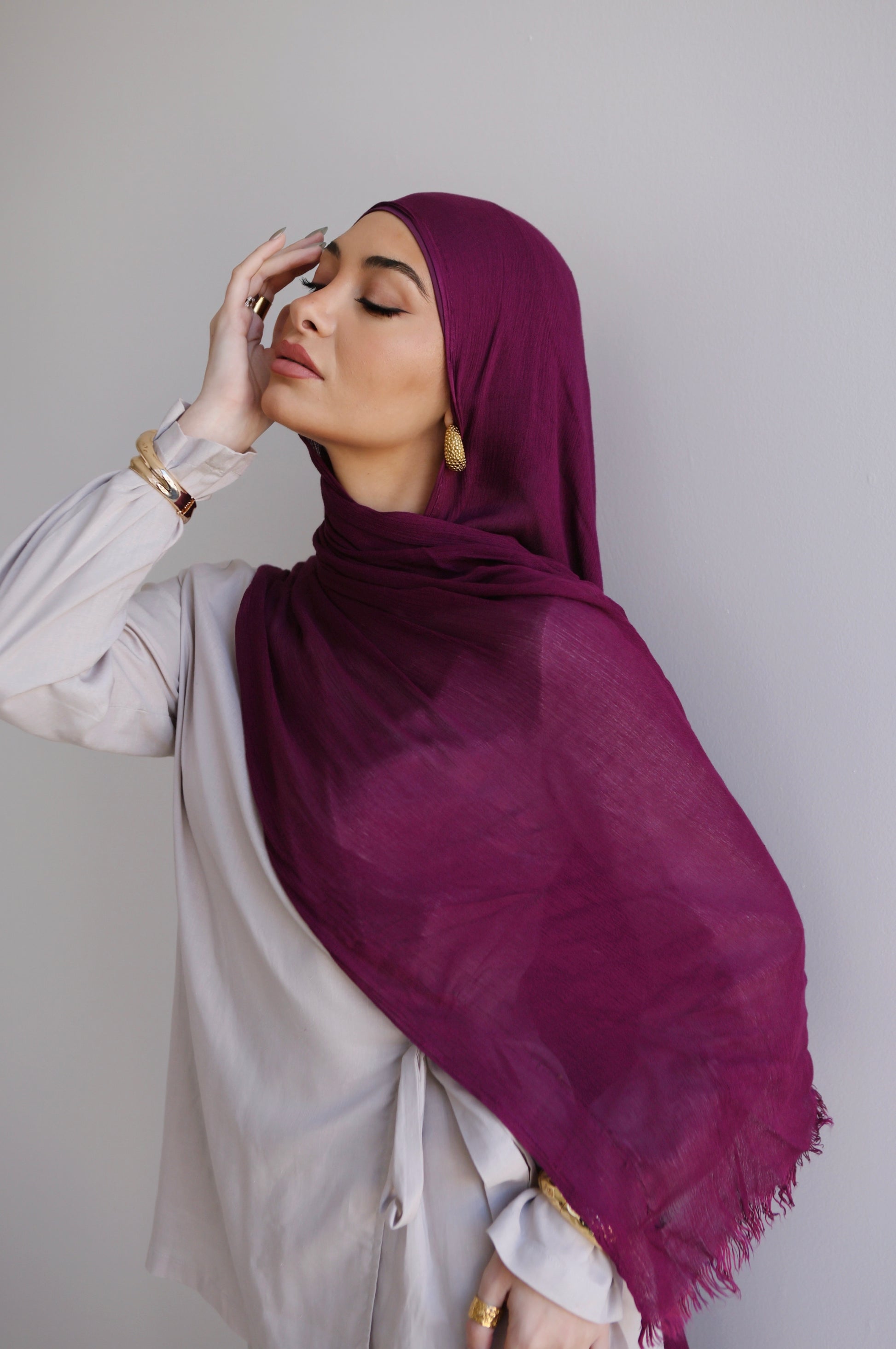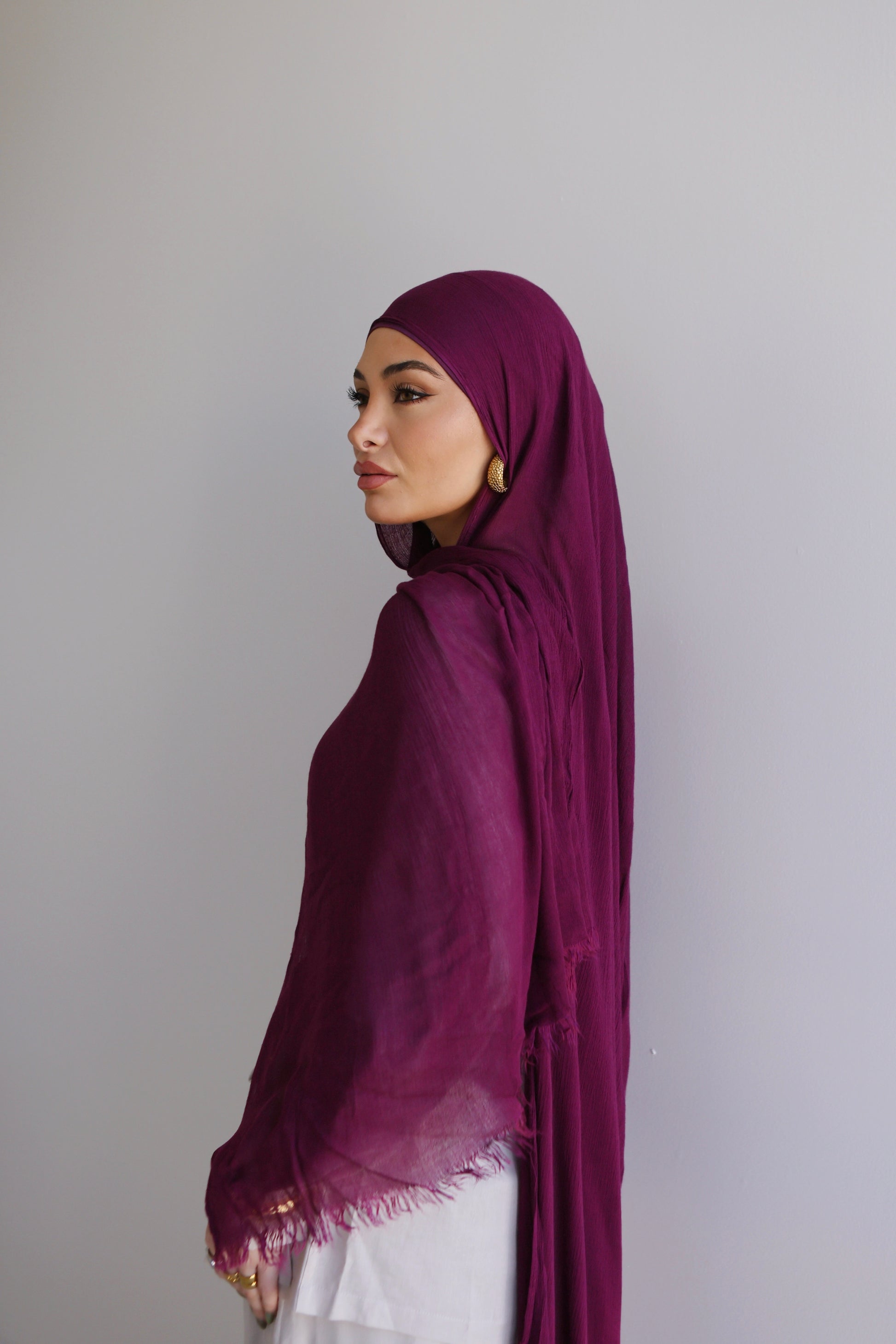 Crafted from soft solid rayon, this hijab offers the perfect balance of comfort and elegance. With a generous size of 185 x 85 cm, it provides versatile styling options—whether draped effortlessly or wrapped neatly. The lightweight, breathable fabric makes it ideal for everyday wear while ensuring full coverage. Finished with subtle raw edges, this piece adds a timeless touch to your modest wardrobe.
