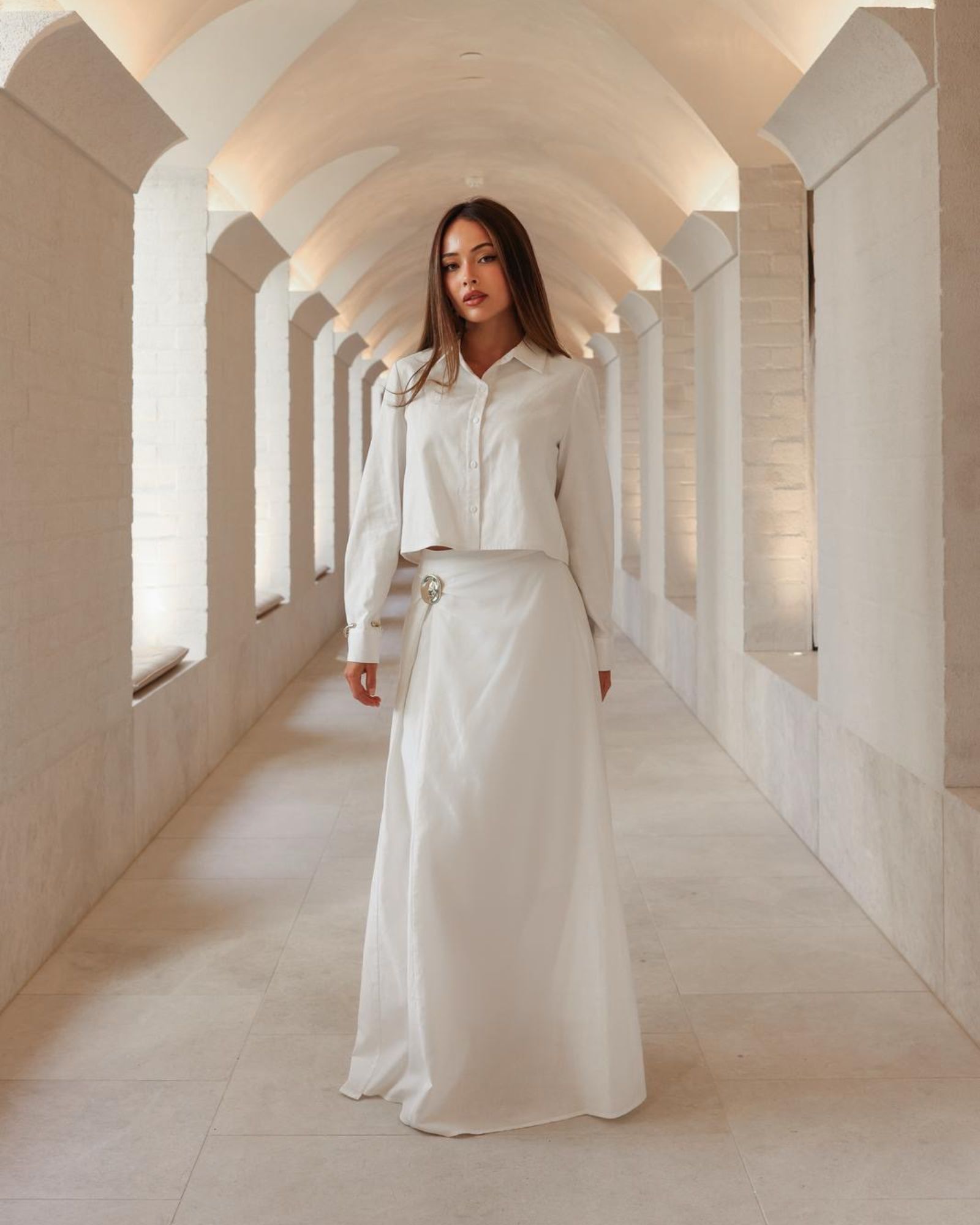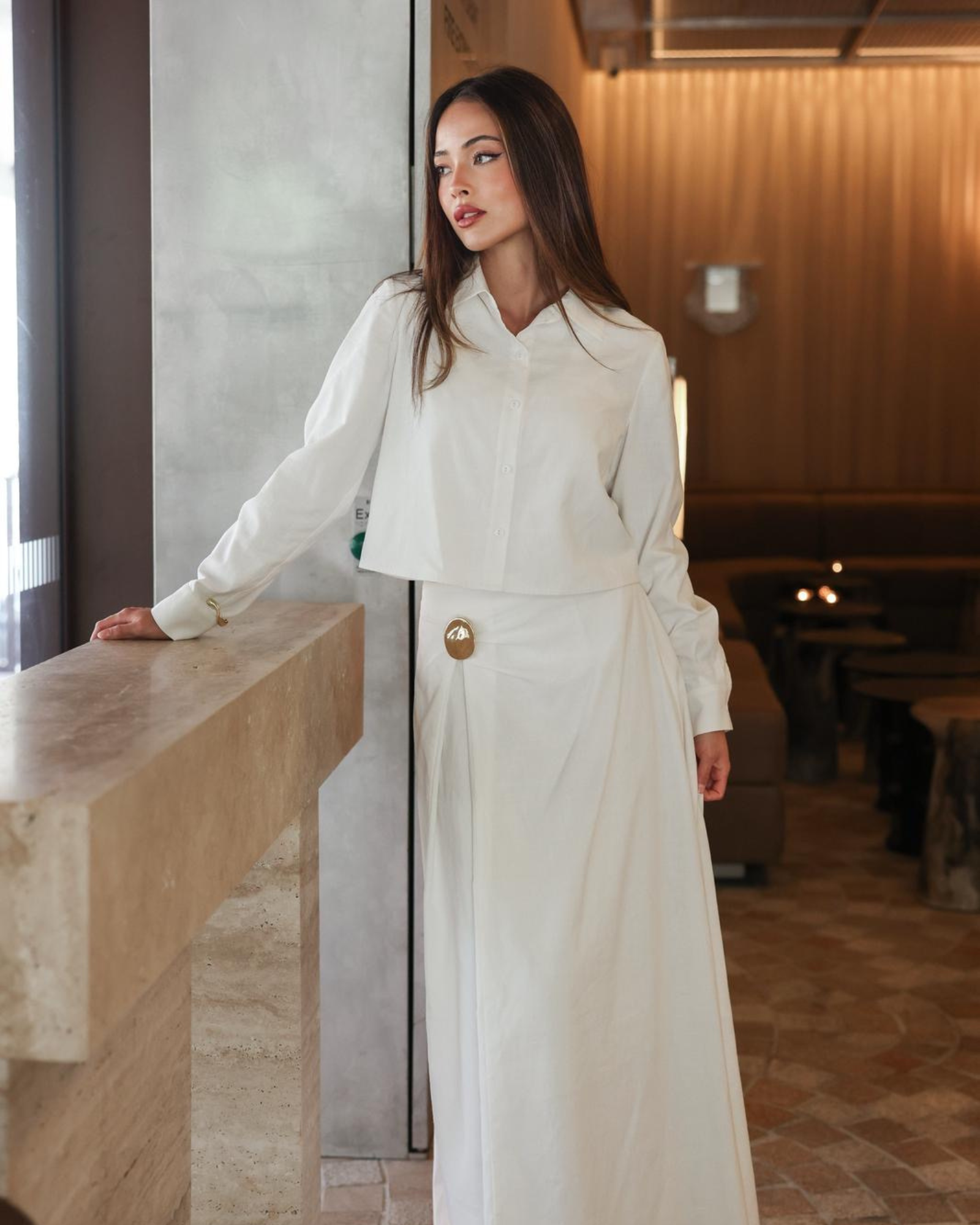 Paired with a high-waisted, A-line skirt, the Pure Essence set embraces femininity with a flattering and graceful fit. The skirt features a modest V-line slit, subtly covered and fully lined to ensure confidence in every step. A removable gold brooch adds a refined touch, elevating the look with a hint of warmth and luxury.