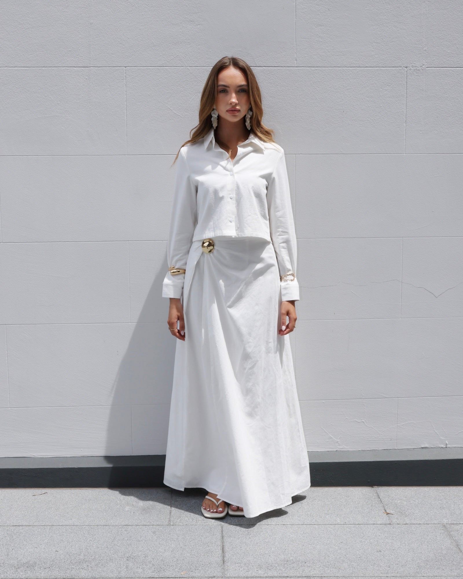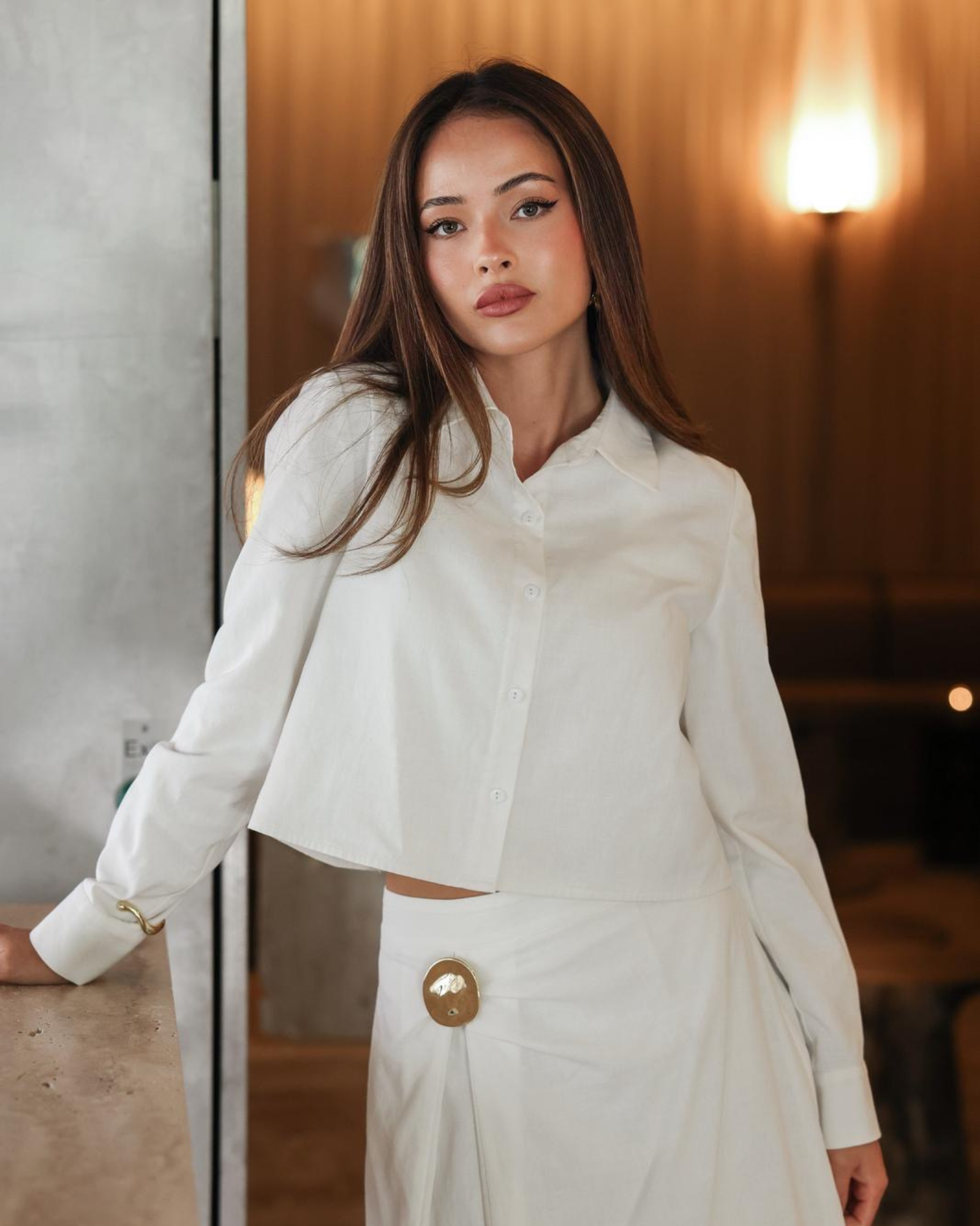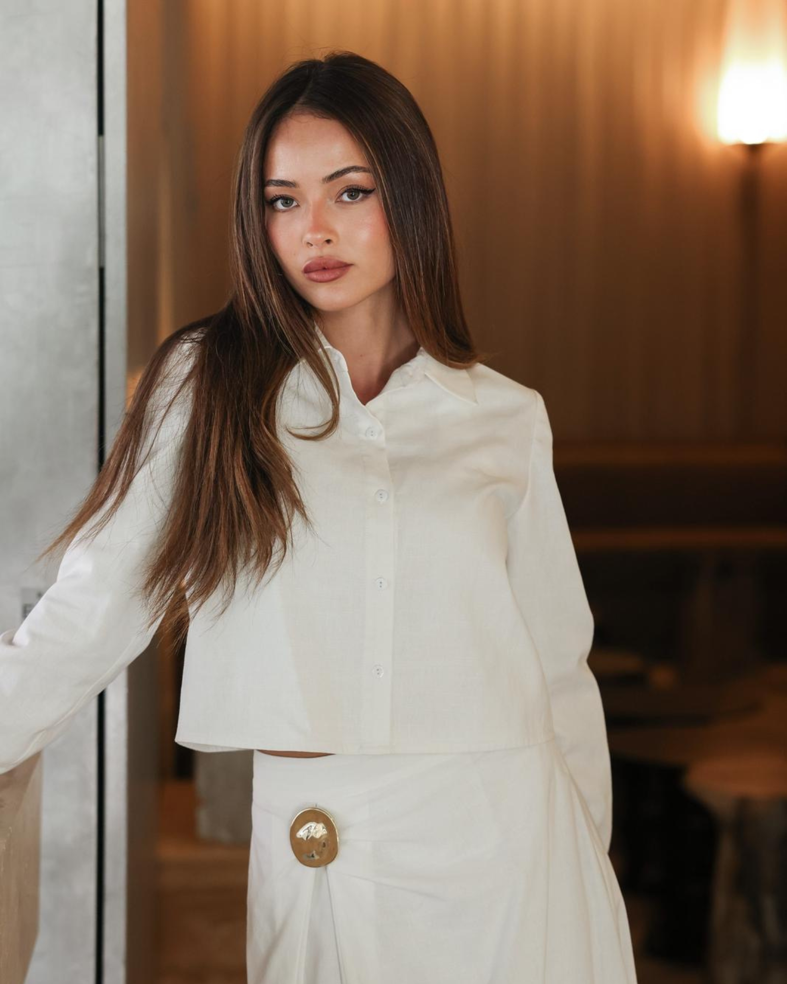 The top is a slightly cropped, long-sleeve button-up that exudes grace and class. Thoughtfully designed with a tailored fit, it drapes beautifully, creating a sleek and structured silhouette. Fully lined for ultimate comfort, this piece allows you to move with ease while maintaining a polished look.