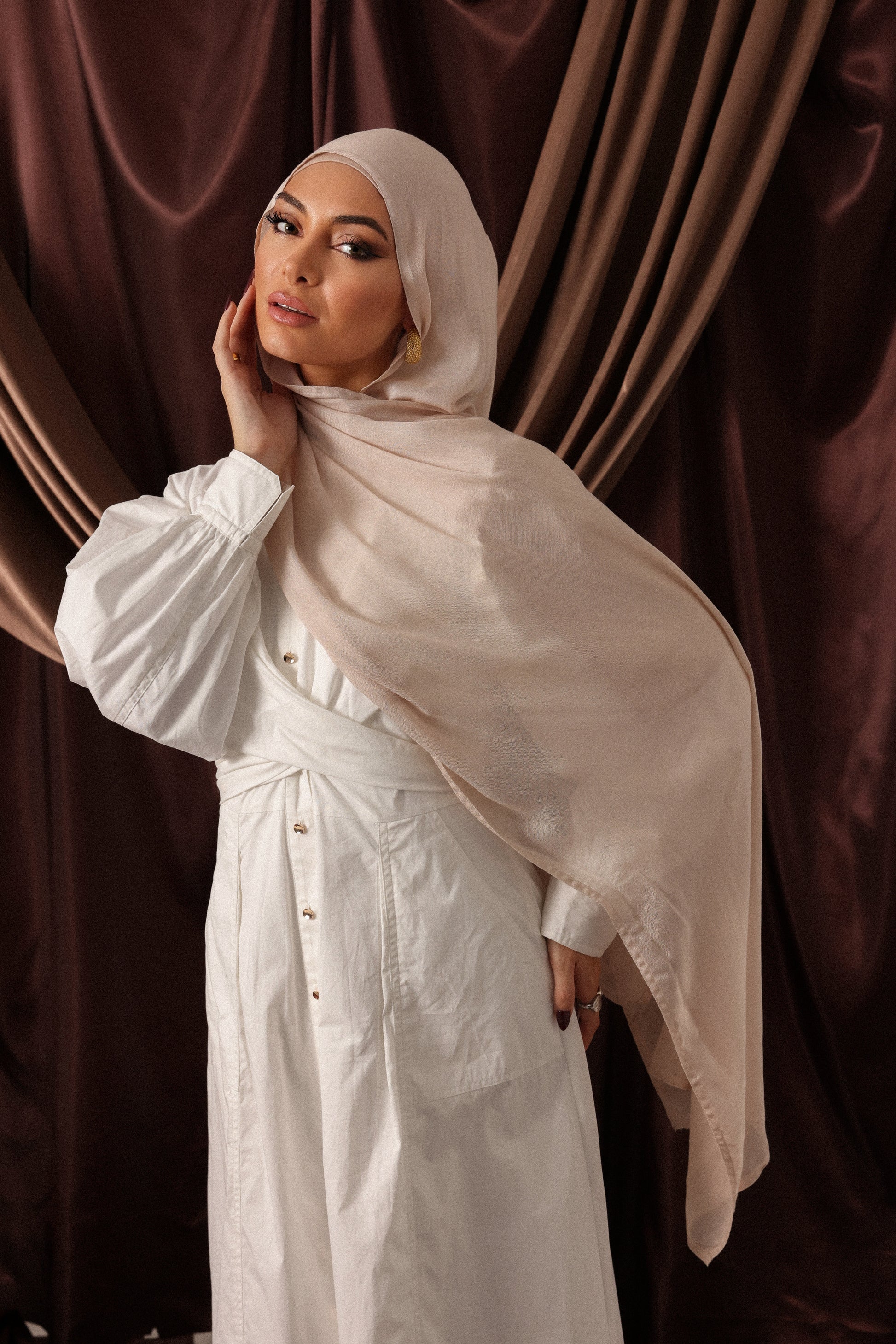 This design is made from custom dyed modal sets. Incredibly light weight and breathable fabric making sure its easy to style. Hijab features a double stitched frame.